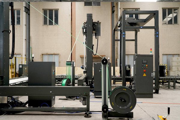 瓦楞紙板捆扎纏繞包裝線2臺(tái)頂壓式托盤穿劍捆扎機(jī)、1臺(tái)搖臂式纏繞包裝機(jī)以及若干滾筒輸送機(jī)組成。針對(duì)瓦楞紙板比較蓬松的特性,該線體配備了帶下壓功能的托盤捆扎機(jī),最大壓力可達(dá)500kg,有效降低包裝體積,同時(shí)讓包裝物更加緊實(shí),防止運(yùn)輸過程中的散落。